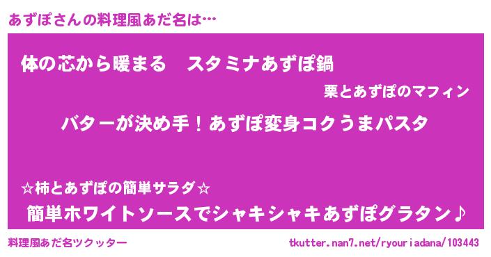 | 女子向けラノベタイトル風あだ名 | 『あずぽ恋絵巻』『あずぽの雑貨屋さん』 |