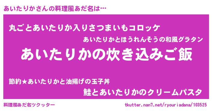 | 胡散臭い通販商品みたいなあだ名 | 『あなたにだけ特別に提供する100年もののヴィンテージワイン…その名も「あいたりか」』 |