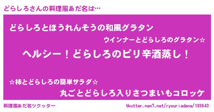 | 女子向けラノベタイトル風あだ名 | 『闇のどらしろ』『どらしろ伯爵の花嫁』 |