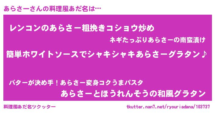| 男性向けラノベタイトル風あだ名 | 『あらさーの嫁は女の子じゃないと思った?』 |