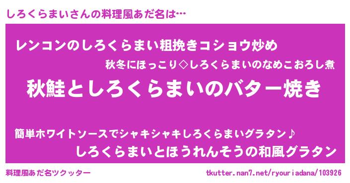 | 男性向けラノベタイトル風あだ名 | 『しろくらまいという概念が存在しない退屈な世界 』 |