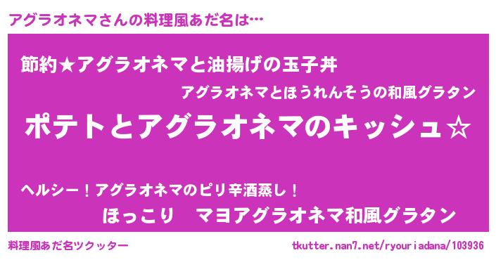 | 男性向けラノベタイトル風あだ名 | 『アグラオネマの嫁は女の子じゃないと思った?』 |