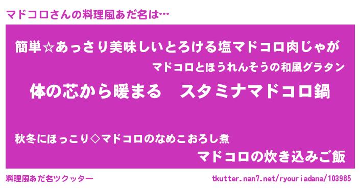 | 男性向けラノベタイトル風あだ名 | 『やはりマドコロの青春ラブコメはまちがっている 』 |