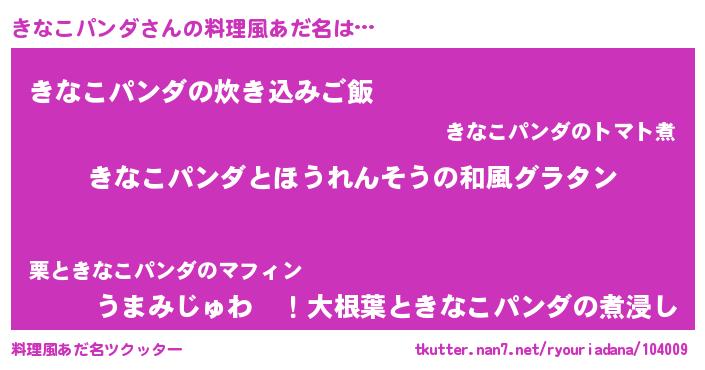 | 男性向けラノベタイトル風あだ名 | 『きなこパンダ~年齢イコール彼女いない歴の魔法使い~』 |