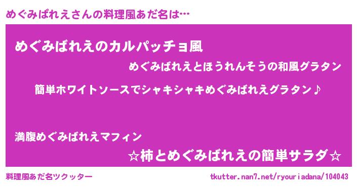 | 男性向けラノベタイトル風あだ名 | 『めぐみばれえの嫁は女の子じゃないと思った?』 |