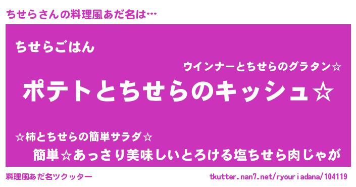| 男性向けラノベタイトル風あだ名 | 『ちせらの嫁は女の子じゃないと思った?』 |