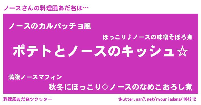 | 女子向けラノベタイトル風あだ名 | 『ノースの卵を拾いまして』 |