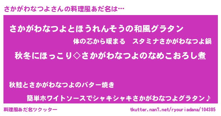 | 男性向けラノベタイトル風あだ名 | 『さかがわなつよに滅ぼされるだけの簡単なお仕事です』 |