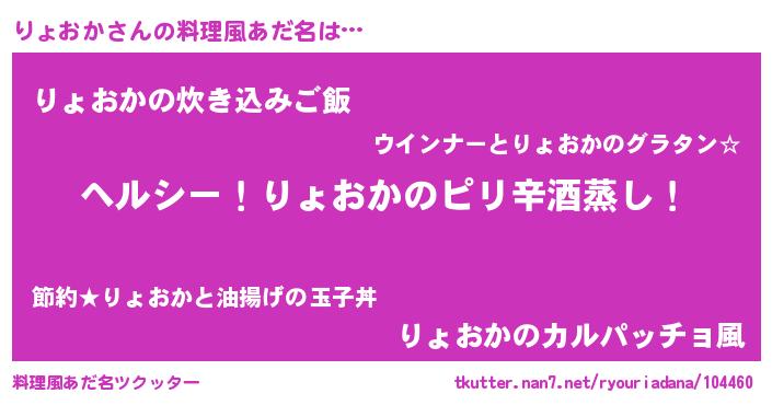 | 男性向けラノベタイトル風あだ名 | 『Re:りょおかから始める異世界生活』 |