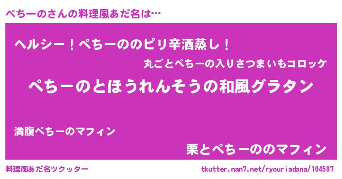 | 男性向けラノベタイトル風あだ名 | 『ぺちーの~年齢イコール彼女いない歴の魔法使い~』 |