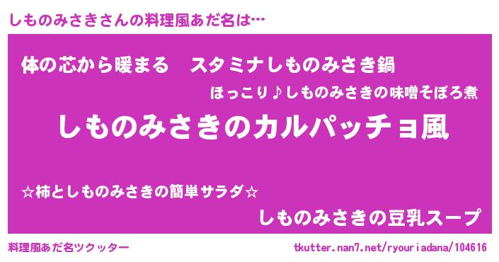 | 女子向けラノベタイトル風あだ名 | 『しものみさきが死なない童話 林檎のしものみさきの診療簿』 |