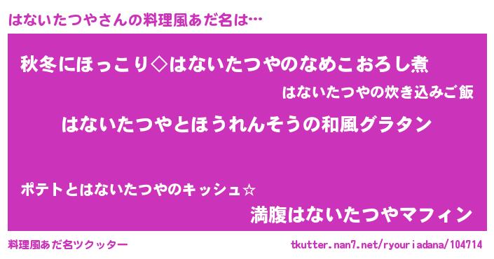 | 女子向けラノベタイトル風あだ名 | 『はないたつやの玉の輿計画!』 |