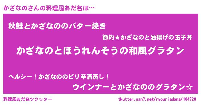 | ヒーロー風カッコイイあだ名 | 『ネオカザナノ』『ウルトラかざなのマン』 |