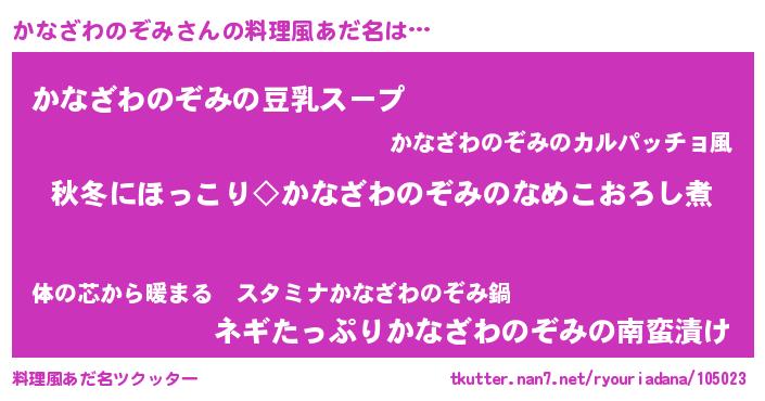 | 男性向けラノベタイトル風あだ名 | 『かなざわのぞみに滅ぼされるだけの簡単なお仕事です』 |