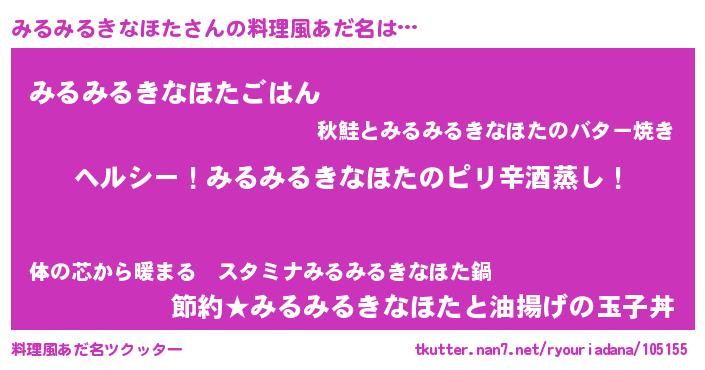 | 男性向けラノベタイトル風あだ名 | 『Re:みるみるきなほたから始める異世界生活』 |