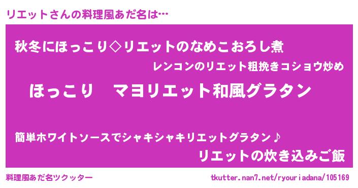 | 男性向けラノベタイトル風あだ名 | 『この素晴らしい世界にリエットを!』 |