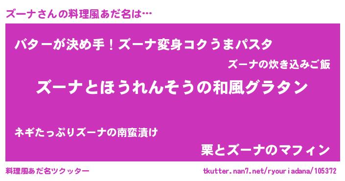 | 女子向けラノベタイトル風あだ名 | 『ズーナの玉の輿計画!』『ズーナ恋絵巻』 |