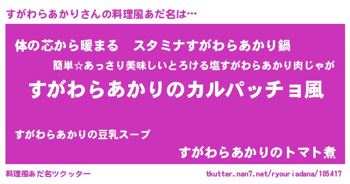 | 女子向けラノベタイトル風あだ名 | 『すがわらあかりが死なない童話 林檎のすがわらあかりの診療簿』 |