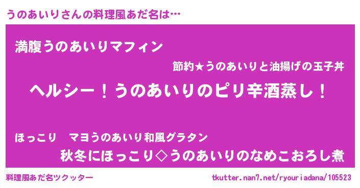 | 男性向けラノベタイトル風あだ名 | 『Re:うのあいりから始める異世界生活』 |