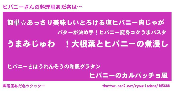| 女子向けラノベタイトル風あだ名 | 『ヒバニーの婚約者』『ヒバニー恋絵巻』 |
