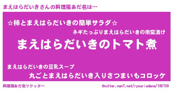 | 女子向けラノベタイトル風あだ名 | 『まえはらだいき夫妻のなれそめ』 |