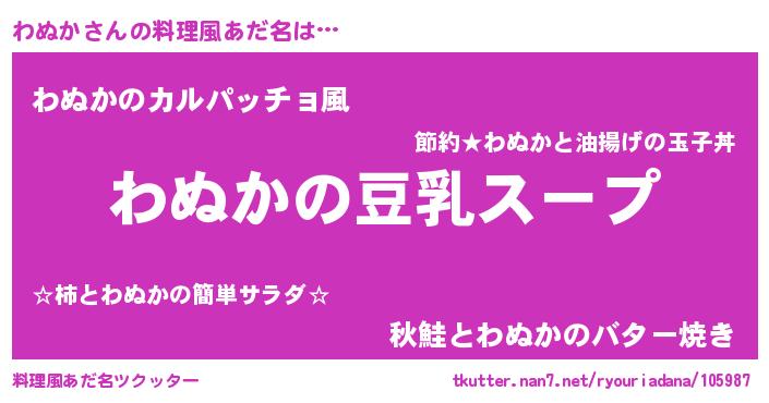 | 胡散臭い通販商品みたいなあだ名 | 『信頼と実績のサプリメント…その名も「わぬか」』 |