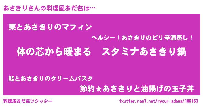 | 女子向けラノベタイトル風あだ名 | 『あさきりの雑貨屋さん』『闇のあさきり』 |