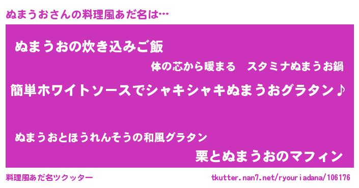 | 男性向けラノベタイトル風あだ名 | 『ぬまうおの嫁は女の子じゃないと思った?』 |