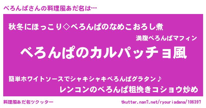 | 男性向けラノベタイトル風あだ名 | 『魔弾の王とべろんぱ』 |
