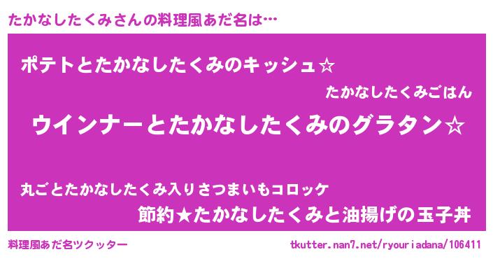 | ポケモン風あだ名 | 『タカナダネ』『ヒタカナシタクミ』 |