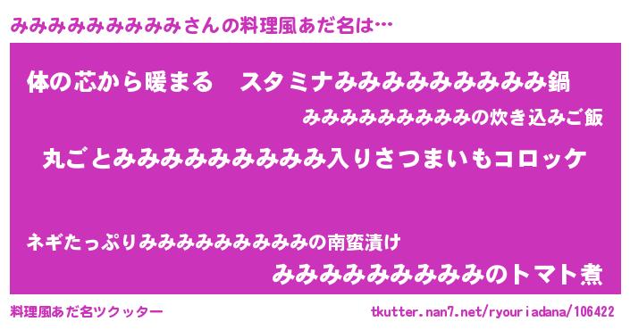 | 男性向けラノベタイトル風あだ名 | 『魔弾の王とみみみみみみみみみ』 |