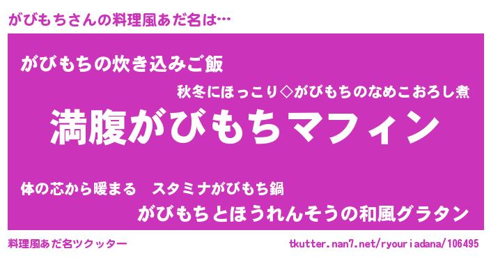 | 女子向けラノベタイトル風あだ名 | 『異世界で失敗しない100のがびもち』 |