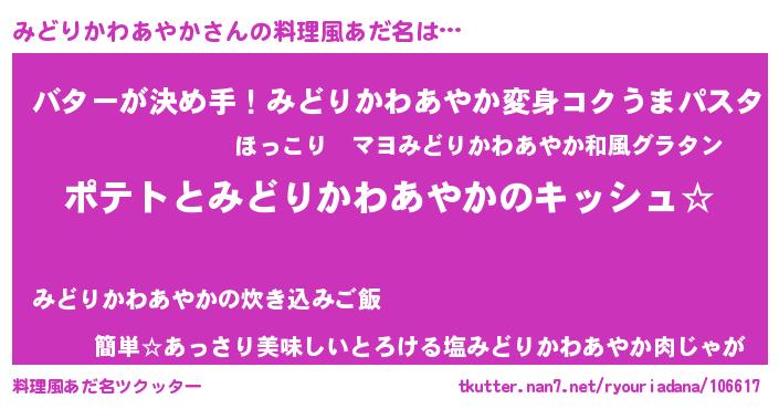 | 女子向けラノベタイトル風あだ名 | 『みどりかわあやかの卵を拾いまして』 |