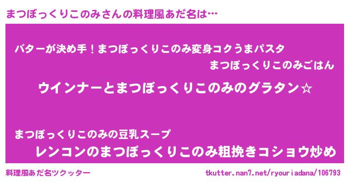 | 女子向けラノベタイトル風あだ名 | 『まつぼっくりこのみ伯爵の花嫁』 |