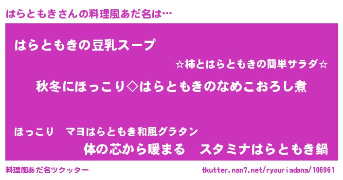 | 男性向けラノベタイトル風あだ名 | 『はらともきに滅ぼされるだけの簡単なお仕事です』 |