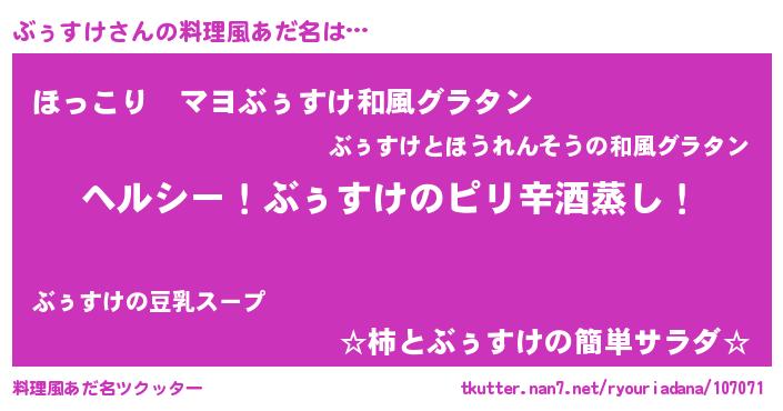 | 女子向けラノベタイトル風あだ名 | 『闇のぶぅすけ』『ぶぅすけは平凡を望む』 |