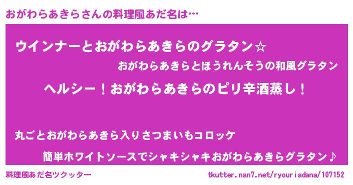 | 男性向けラノベタイトル風あだ名 | 『Re:おがわらあきらから始める異世界生活』 |
