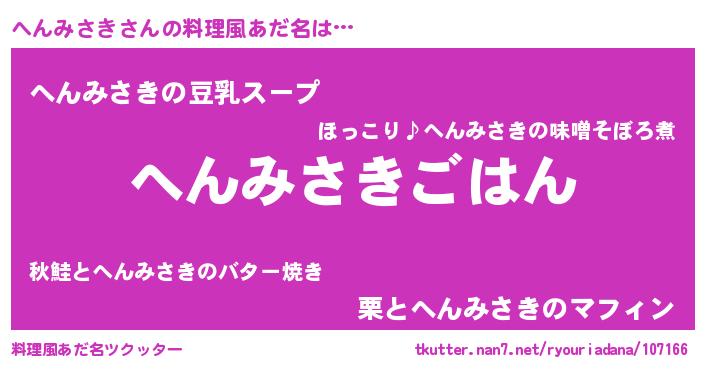 | 胡散臭い通販商品みたいなあだ名 | 『信頼と実績のサプリメント…その名も「へんみさき」』 |