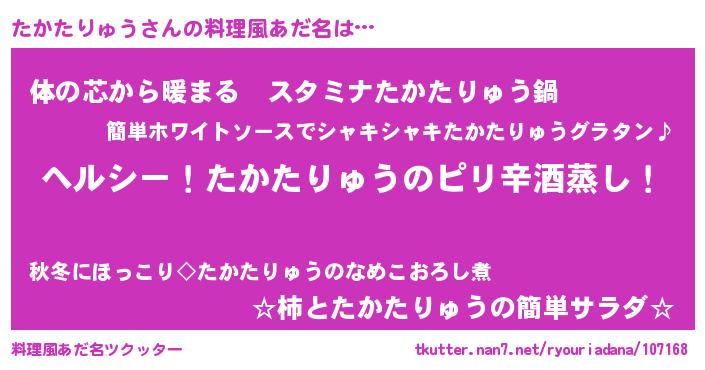 | 男性向けラノベタイトル風あだ名 | 『Re:たかたりゅうから始める異世界生活』 |