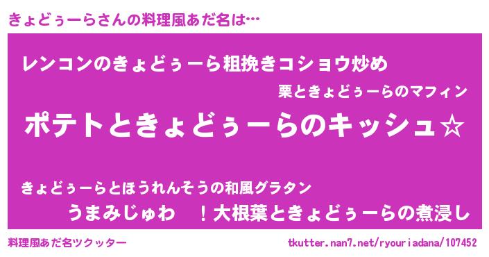 | 男性向けラノベタイトル風あだ名 | 『きょどぅーらの嫁は女の子じゃないと思った?』 |