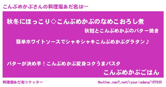 | 男性向けラノベタイトル風あだ名 | 『こんぶめかぶの嫁は女の子じゃないと思った?』 |