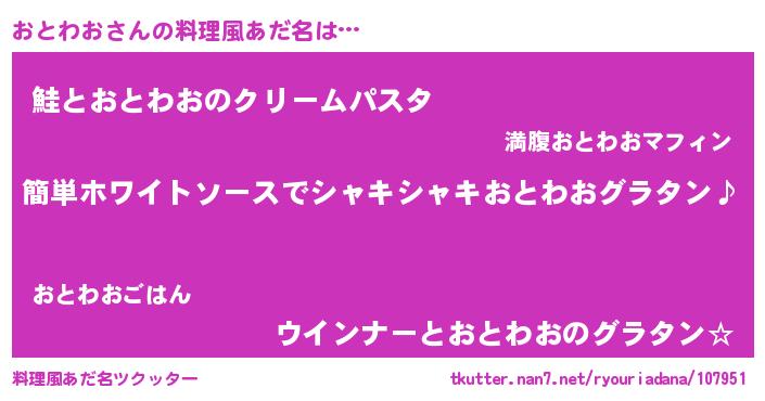 | 男性向けラノベタイトル風あだ名 | 『おとわおの嫁は女の子じゃないと思った?』 |