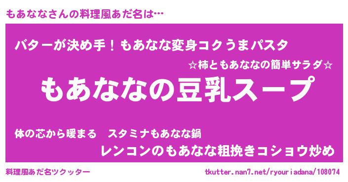 | 胡散臭い通販商品みたいなあだ名 | 『信頼と実績のサプリメント…その名も「もあなな」』 |