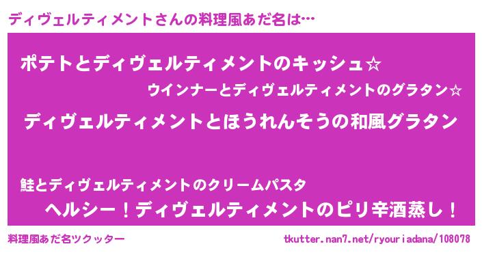 | 女子向けラノベタイトル風あだ名 | 『ディヴェルティメントの玉の輿計画!』 |