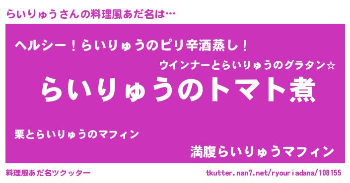 | 男性向けラノベタイトル風あだ名 | 『おまえをオタクにしてやるから、俺をらいりゅうにしてくれ! 』 |