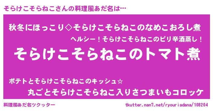 | 男性向けラノベタイトル風あだ名 | 『おまえをオタクにしてやるから、俺をそらけこそらねこにしてくれ! 』 |