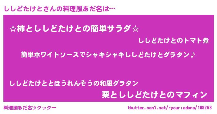 | 男性向けラノベタイトル風あだ名 | 『ししどたけとの嫁は女の子じゃないと思った?』 |