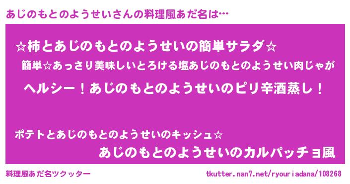 | ヘコむあだ名 | 『あじのもとのようせい(笑)』『あじっぺ』 |
