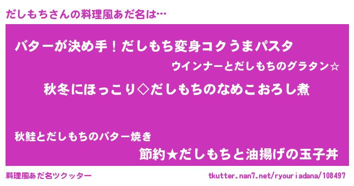 | ヒーロー風カッコイイあだ名 | 『慈愛の使者だしもち』『ネオダシモチ』 |