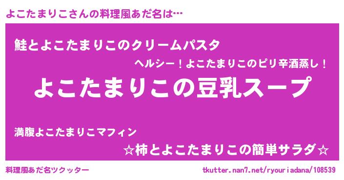 | 胡散臭い通販商品みたいなあだ名 | 『信頼と実績のサプリメント…その名も「よこたまりこ」』 |